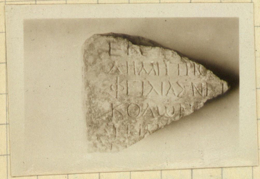 | Description: | Inscribed fragment. Left side rough picked, and back smooth preserved. Other edges broken. Remains of six lines of the inscription. Pentelic marble. | |