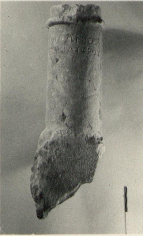 | Description: | Inscribed fragment of columnar grave monument. Small column largely complete, with tongue for setting. Two lines of the inscription preserved. Hymettian marble. | |