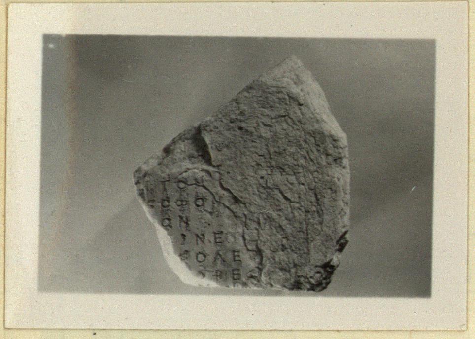 | Description: | Inscribed fragment. Back lightly chisel gouged; right side seems preserved, though surface is badly weatherd. Six lines of the inscription preserved; stoichedon. Pentelic marble. Transferred to the Epigraphical Museum on 13th. April 1968; now EM 13378 (IG I2, no. 951); with EM 10231. | |
