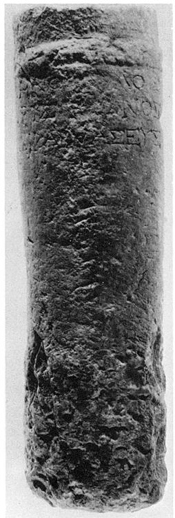 | Description: | Inscribed columnar grave monument. Complete save minor fractures. Three lines of the inscription preserved. Hymettian marble. | |
