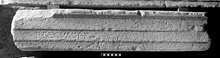 On the front and right side, three fasciae; above, a shallow double moulding: flat cyma and small torus.