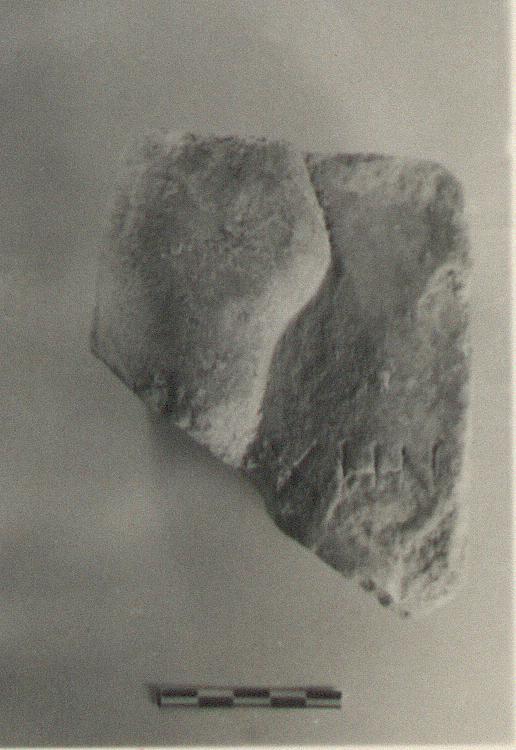 | Description: | Inscribed fragment. Inscribed face, right side, probably back preserved; possibly also the top, for this seems to be a votive plaque representing a human leg, of which the hip and thigh are preserved. Three letters preserved, inscribed at the right. Pentelic marble. | |