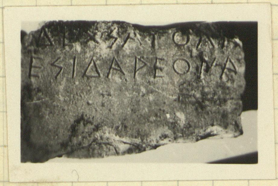 | Description: | Upper left corner of inscribed block. Broken at bottom and right; the top, dressed smooth, is worn with later use and chipped along the edges. On the left side, anathyrosis, with a band along the front 0.041m. small rough picked area preserved at the back. The face, uniformly dressed with a pointed chisel, is inscribed in two lines, nine letters in the first, ten in the second. Epigram; mentions Darius (?). Or a base (?). Pentelic marble. Cf. I 303. | |