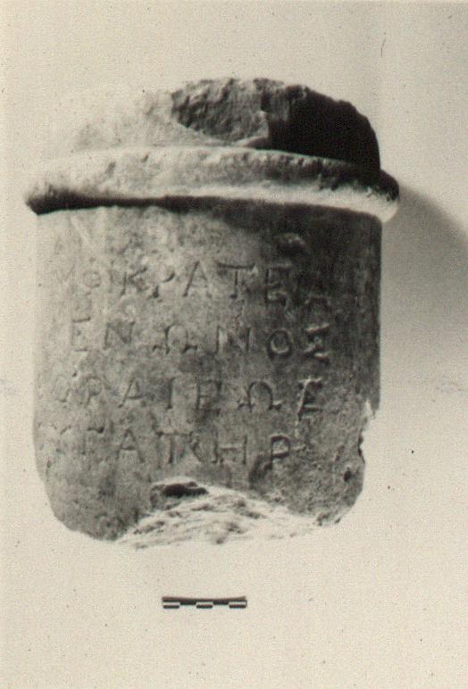 | Description: | Inscribed fragment of columnar grave monument. Inscribed face and top preserved. Inscription complete. Four lines of the inscription preserved. Hymettian marble. | |