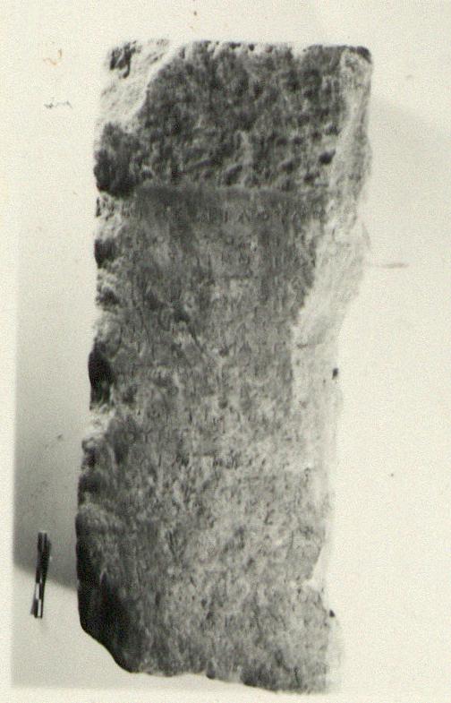 | Description: | Inscribed fragment from upper left corner of stele. Moulding above roughly chipped away. Top flat (?). Toothed left side. Rough picked back. Mentions the archon Theophilos. Twenty lines of the inscription preserved. Hymettian marble. | |