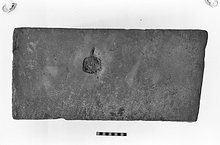 Bottom and top are probably the original surfaces; bit of original right edge preserved at front of right side. Rough re-cuttings at left and back.
