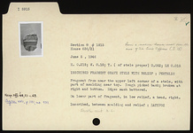 | Description: | Inscribed fragment of grave stele with relief. Fragment from near the upper left corner of a stele, with part of moulding near top. Rough picked back; broken at right and bottom. Edges much battered. On lower part of fragment, in low relief, a head, right. Inscribed between moulding and relief:"ΣΑΤΥΡΟΣ". Pentelic marble. | |