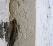 | Context: | Found built into west face of the late Roman Fortification, near the north end of the colonnade of the Library of Pantainos. | |