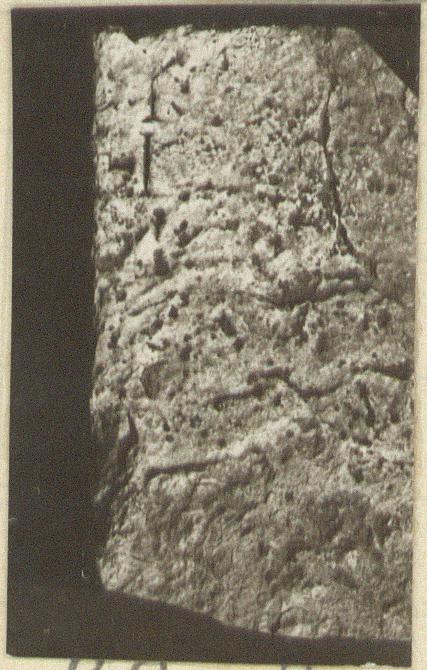 At the left edge of the block several large letters, clearly the ends of several lines of an inscription the main part of which was on the adjacent block IG II2, no. 4209, which now lies in the doorway of room 9 from the south of the Stoa of Attalos.