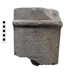| Description: | Inscribed fragment of columnar grave monument. Broken below, somewhat damaged above and a piece split off at the back. Hymettian marble. | |