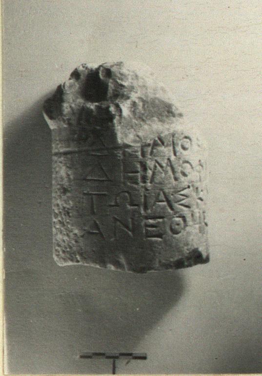 | Description: | Inscribed fragment. About half the circumference preserved of a small round column with mouldings (chipped away) below the flat top. On top part of the round dowel hole is preserved. Letters below the mouldings. Gray-blue marble. | |