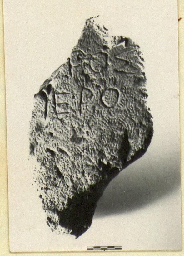 | Description: | Inscribed fragment. Broken top, bottom and sides. A little rough picked back remains. Poros. | |