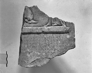 Relief above inscription; at right, feet of draped figure left, and to left of fragment, a dolphin.