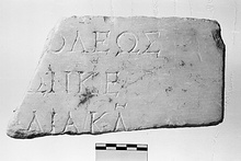 Fragment Τ 1419 b), top with cyma reversa moulding. The moulding is so placed as to suggest that the inscribed surface was originally the top of the slab, the "back" the bottom.
