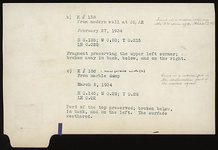 | Description: | Inscribed fragments. Fragment Ι 187 a), broken on all sides. The face of the inscription is rough picked. Part of two lines of the inscription preserved, and of one letter in a third line above. Fragment Κ 138 b), preserving the upper left corner; broken away in back, below, and on the right. Fragment Κ 186 c), part of the top preserved; broken below, in back, and on the left. The surface weathered. Joins with fragment a). Hymettian marble. ADDENDA With I 1370. | |