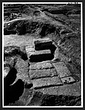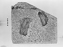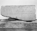 Broken below at left. Much of back missing, but joining fragments give some of back surface. Most of top surface roughly reworked with pointed chisel.