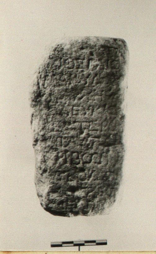 A roughly oblong block cut from a sizable stele (?); part of the original inscribed face and rough picked back preserved. Left side broken, right side sawn smooth; top possibly original.
