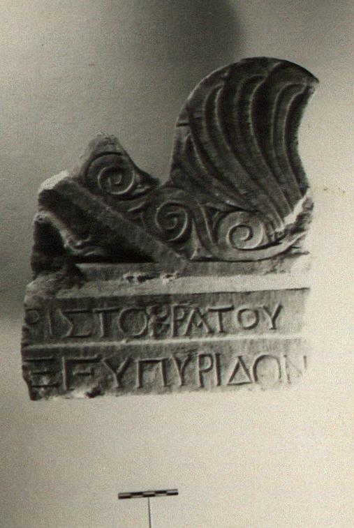 | Description: | Inscribed fragment. Broken at left and behind. Upper right corner of a grave monument with palmette akroterion and part of pediment. The inscription on the two fasciae below. Underside smooth picked. Pentelic marble. | |