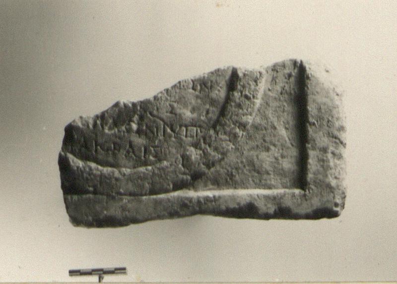 | Description: | Inscribed fragment. Broken from lower left (proper) corner of a relief with part of a wreath preserved. Raised border. Within the wreath, names. Pentelic marble. | |