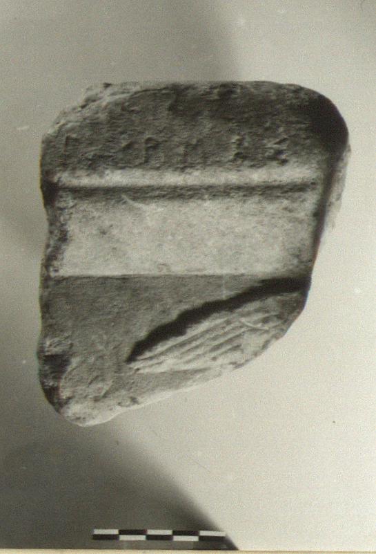 | Description: | Inscribed fragment. Broken left, right, below and behind. Flat top. The inscription is on a flat moulding at the top of the front face. Below this a moulding, then the main face of the monument with part of a small wing in low relief. Pentelic marble. | |