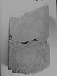 Dimensions:   H. 0.365, (as joined) 0.805; Lett. H. 0.005; W. (below) 0.467, (above) 0.45, (as joined, at highest preserved part) 0.432; Th. 0.11, (as joined, at highest preserved part) 0.107
