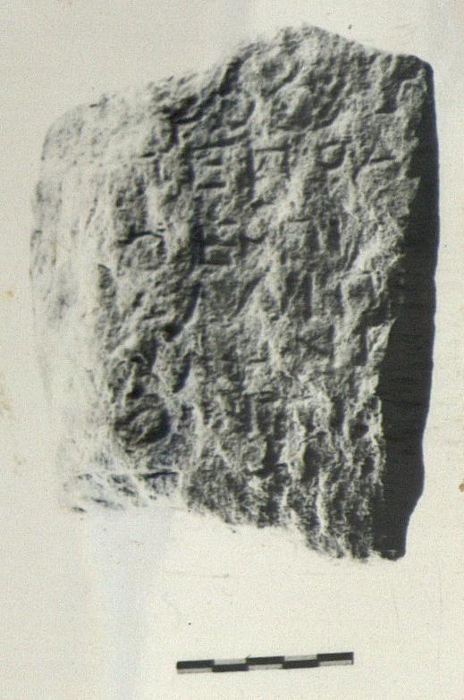 | Description: | Inscribed fragment. Broken all around, back rough picked, front badly weathered. Six lines of the inscription preserved; non-stoichedon. Blue and orange-grained marble. | |