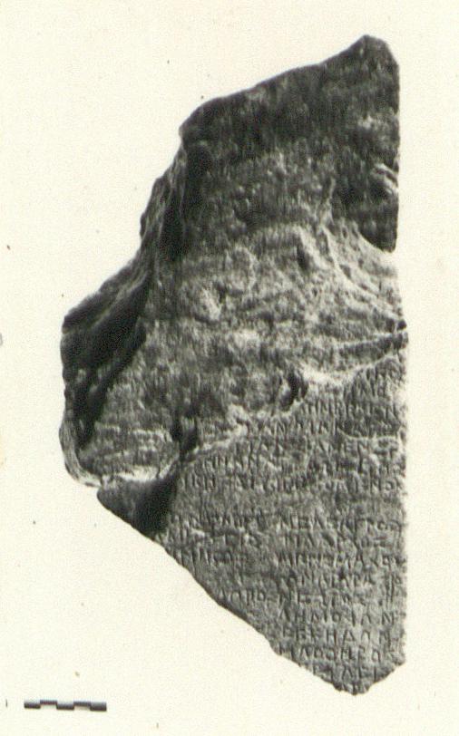 | Description: | Inscribed fragment. Broken above, below and at left. Back surface very rough picked; right side worked smooth with tooth chisel. Only relatively small triangular area of inscribed surface reserved. Non-stoichedon. Blue Hymettian marble. | |