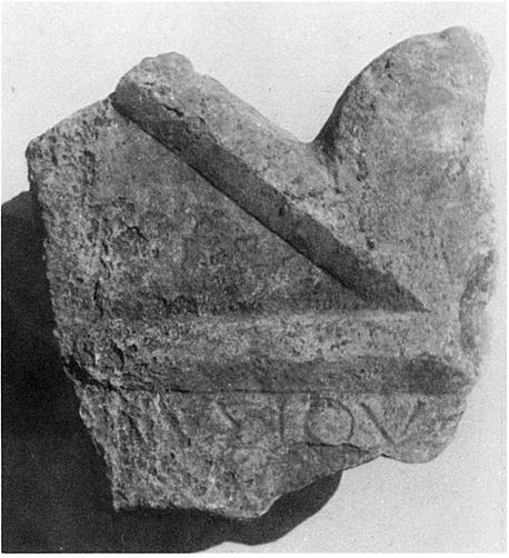 | Description: | Upper right corner of pedimental grave stele. Broken on left side and bottom, also at back. The pediment is outlined by a raised band, and bounded on the right side by a finial in the form of a semicircle resting on one of its ends, and with the joining arc of the semi-circle certical. Six letters and part of a seventh preserved. White marble. | |