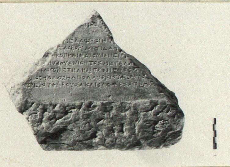 | Description: | Inscribed fragment. Broken on three sides. Back and bottom surfaces are original. Bottom has relieving edge. Lower 0.08m. of surface of face rough. Laurion mines. Parts of eight lines of the inscription preserved; non-stoichedon. Gray marble. | |
