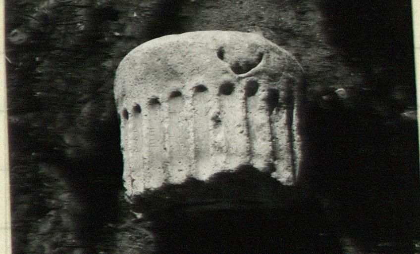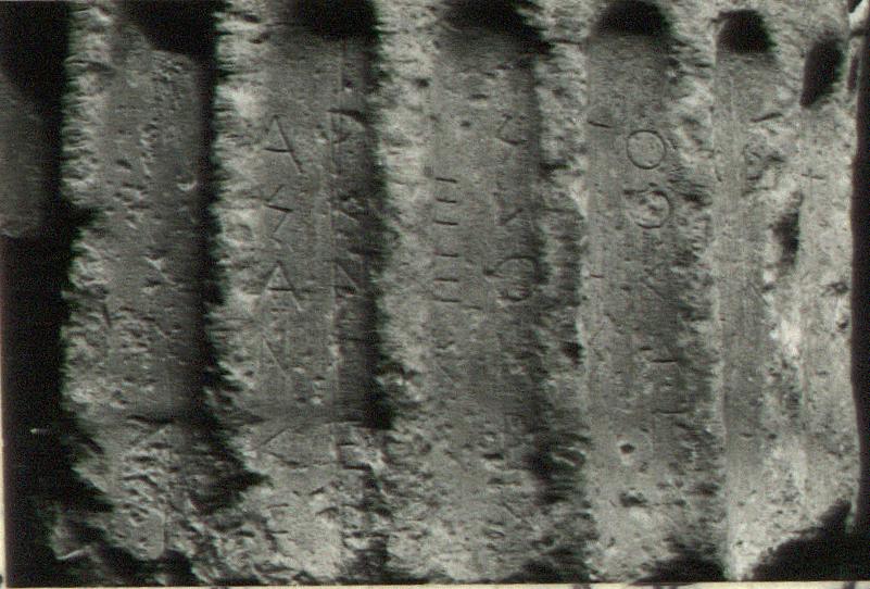 | Description: | Inscribed column shaft. Largely complete though very battered and worn. Several large cuttings from later use as a millstone. Top drum of the shaft of a large fluted column (Ionic?). The flutes stop well below the top which is somewhat larger in diameter, apparently to receive a dedication. Three indistinct triangular areas-leaves (?)- curl down over the edge, suggesting the placement of the three legs of a tripod. The inscription runs horizontally across the flutes, two letters in each flute. | |