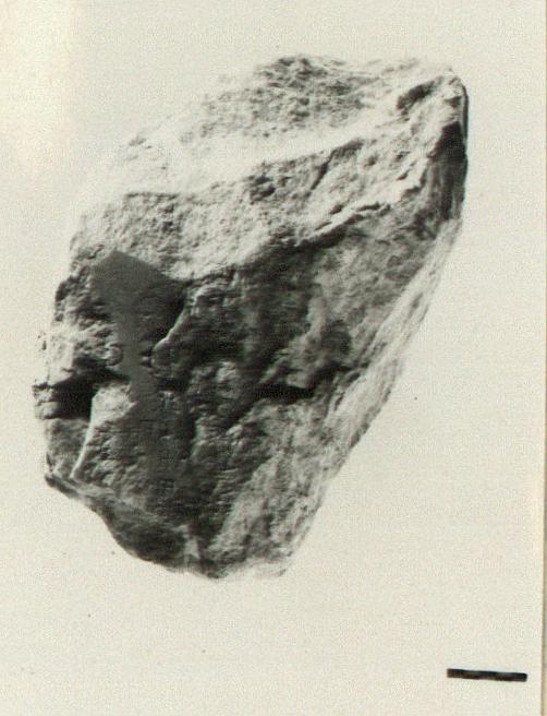 | Description: | Inscribed fragment of Building Account or Altar (?). Large battered fragment. Only a small part of original face and a bit of the right edge preserved, broken away elsewhere. Seven letters remain. Crystalline white marble. | |