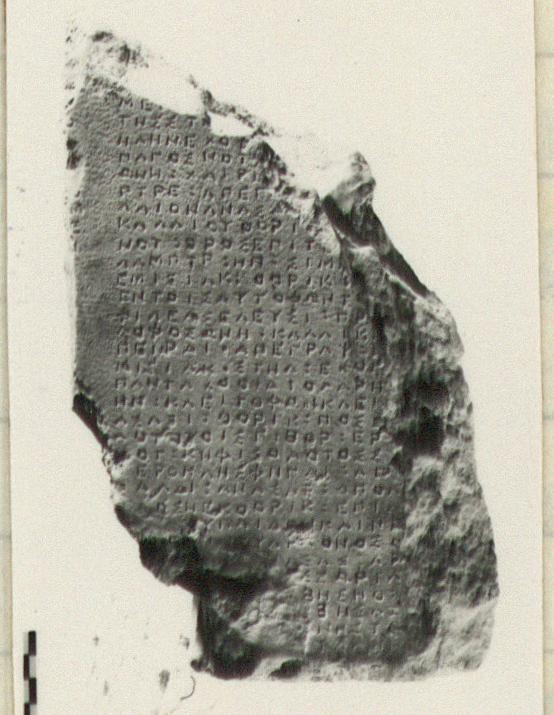 | Description: | Inscribed fragment. Broken on both sides and top. Reverse side originally appears to have also been incised. No longer legible. Bottom roughly marked. "POLEITAI" account. Two columns of inscription of left hand column have only last letters of five lines. 0.016m. separates the two columns. Of right hand column have thirty-two lines; no line is complete. White marble. ADDENDA Joins with I 4782. | |
