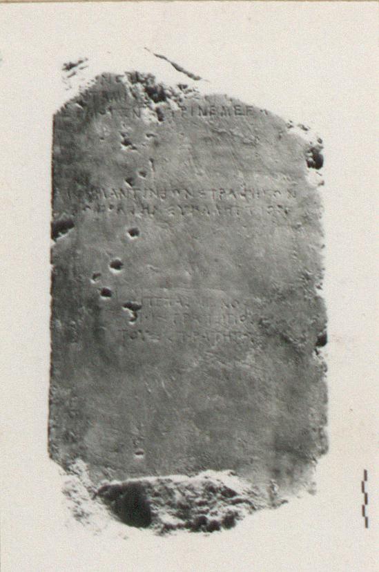 | Description: | Inscribed fragment. Broken at top and lower right corner. Stele with part of tenon. Honoring a mantis. Hymettian marble. | |