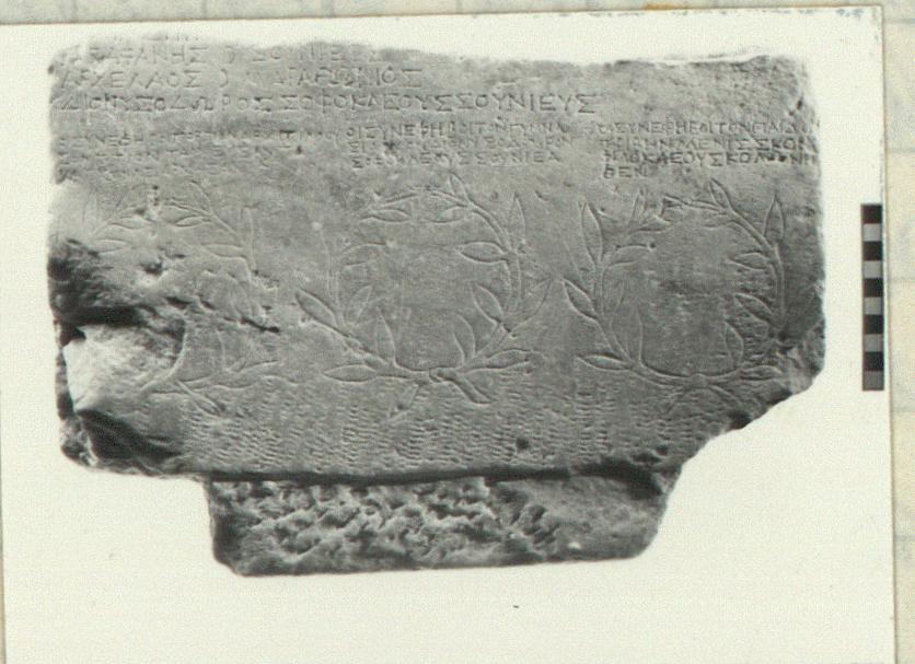 | Description: | Inscribed fragment. Broken at top, chips off bottom. Front smooth; inscription on top; row of three wreaths below. On side very smooth; other side left rough picked. Back and bottom very rough. On bottom a tenon; bottom of tenon very smooth. Blue Hymettian marble. | |