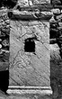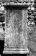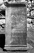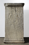 | Description: | Chipped on sides and at molding on top. Rectangular altar, square in section. Molding at top and bottom. Top flat. Relief on three faces: 1) scene of sacrifice with a bull, large square hole in center (re-use?), 2) sacrifice of a goat, 3) scene with Pan, Dionysos and Satyr. Fourth face with inscription on three lines, large letters but extremely worn. White marble. | |