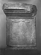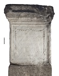 | Description: | Large inscribed base of grave monument. Dimensions preserved complete, though at the bottom the projecting base-moulding has been broken away, and the under surface is preserved only near the middle of the block. At the top, the corner ornaments are chipped, and the front right corner is broken away. Top surface rough picked, with a large shallow round cutting in the center. Back plain, picked fairly fine. Sides dressed with toothed chisel; on the left, a thin flat oval pendant in relief (tambourine?), projection ca. 0.012m; on each side of it, and below, an ivy leaf in low relief. On the right side, a pair of castanets (?). The inscription given both in Greek and in Latin. The inscribed face, below the heavy crowning which is carried round all four sides of the block, is framed with a shallow cymation; the mouldings finished smooth; the face more roughly, with a toothed chisel. Above the moulding, the upper 0.105m. of the block is cut ca. 0.022m. and roughly dressed. Pentelic marble. | |