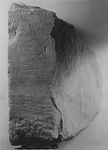The back rough picked, much worn; the left side rough picked, with a toothed chiselled band, along the front edge. At the bottom, the start of a tongue for setting is preserved; above this the lower part of the stele is left rough for ca. 0.06m. Top and right broken.