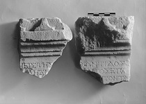 Description:   Fragments of inscribed stele, crowned by moulding.
