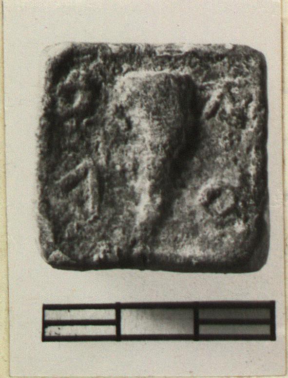 | Description: | Small square block with elongated object (cornucopia ?) and letters in relief on upper face. | |