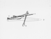 | Description: | Preserved complete in five joining fragments. (Three fragments, one corroded against part of a second bit-shaped object, IL 1066, and one corroded against light spearhead IL 1059). Composed of two sections, equal in length, the whole resembling in shape a snaffle bit. Sections are joined by interlocking loops at one end; the other end of each section is terminated in a free loop. Constructed from two interlocking strands of iron twisted to form shaft. Ends are tucked back to form free loops. See Nb. p. 2793 for details of construction and drawings. See IL 1066, for same object, slightly smaller in size. IL 1063 and IL 1066: 189.9gr | |