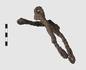 | Description: | Preserved complete in five joining fragments. (Three fragments, one corroded against part of a second bit-shaped object, IL 1066, and one corroded against light spearhead IL 1059). Composed of two sections, equal in length, the whole resembling in shape a snaffle bit. Sections are joined by interlocking loops at one end; the other end of each section is terminated in a free loop. Constructed from two interlocking strands of iron twisted to form shaft. Ends are tucked back to form free loops. See Nb. p. 2793 for details of construction and drawings. See IL 1066, for same object, slightly smaller in size. IL 1063 and IL 1066: 189.9gr | |