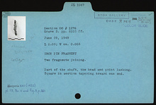 | Description: | Two fragments joining. Part of the shaft, the head and point lacking. Square in section tapering toward one end. 4.0gr | |