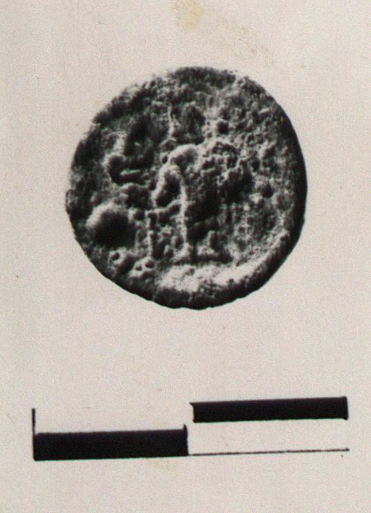 | Description: | A: standing draped male figure (Asklepios ?), facing, head turned to left. Serpent staff in field at left. B: illegible. | |
