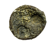 | Description: | Obverse: Dionysos on throne, right. Staff in left hand, uncertain object in right. Crescent in field left with kantharos below, lower right thyrsos or cluster. Letters around edge: ΙΕΡΑC ΓΕΡΟΥCΙΑC. Border of dots. Two countermarks of stork and lizard. Reverse: plain. Cf. IL 477, 1336, etc. | |