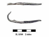 | Description: | Appears complete. One end blunt, other is pointed, shaped to curve for ca. one third the lenght of the tool. A hook (?) Cf. IL 1508. | |