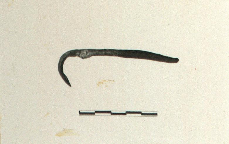 | Description: | Appears complete. One end blunt, other is pointed, shaped to curve for ca. one third the lenght of the tool. A hook (?) Cf. IL 1508. | |