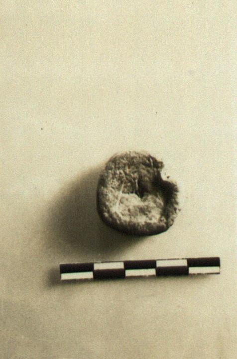 | Description: | A thick round disk. A squarish stamp on its upper face. | |
