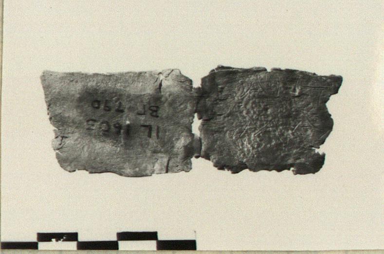 | Description: | Two pieces, a third piece from left end (side B) missing. Originally folded in three. Inscription on both sides. <graphic> | |