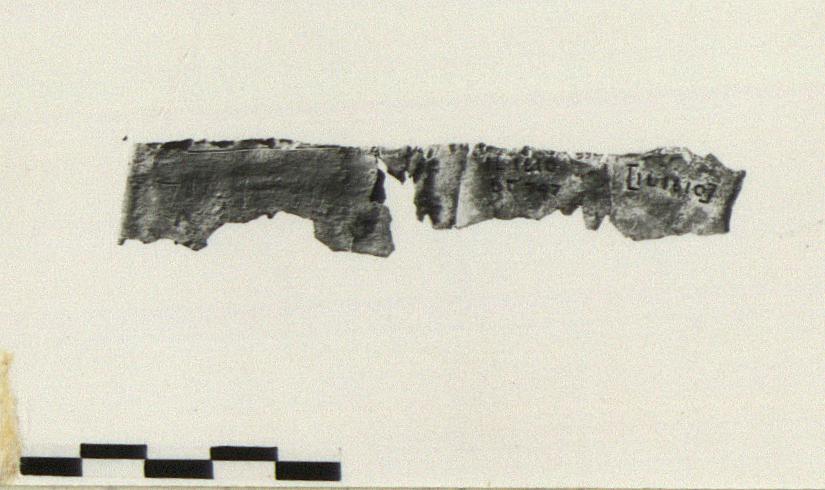 | Description: | Lenght complete in three joining fragments. Upper edges (side B) broken away. Originally folded in two. Inscription on both sides. <graphic> | |