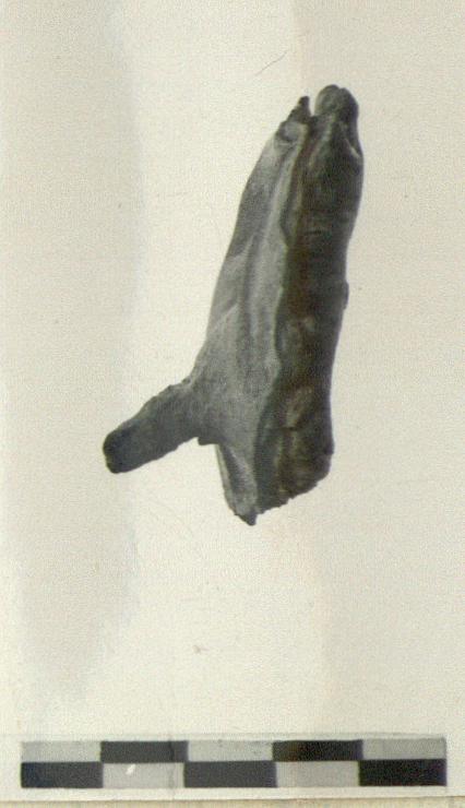 | Description: | One piece broken off during attempt to unfold it. Folded in several layers and transfixed with iron nail. There is a hole from another nail, which is missing. A number of obscure letters on the outside surface. Cannot be unfolded. | |